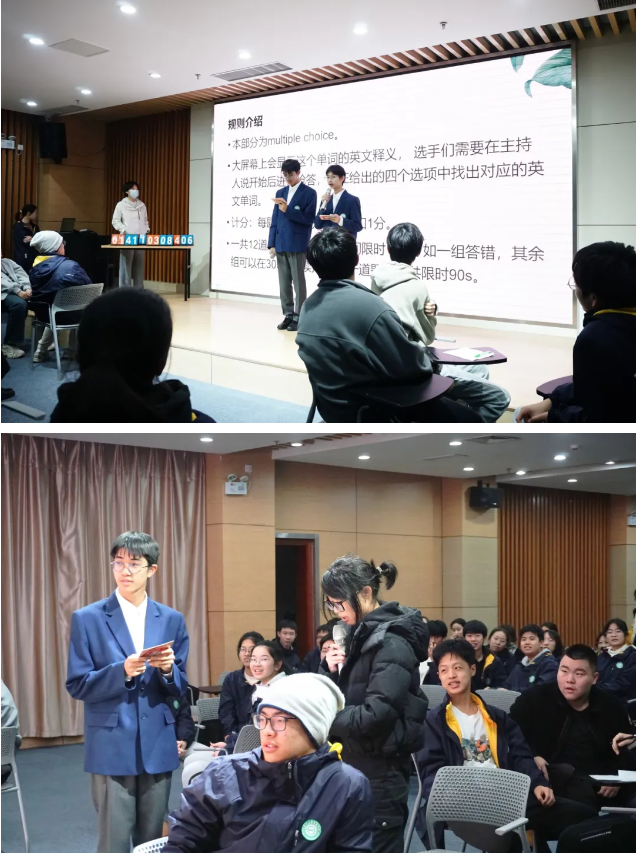 第三部分是单项选择环节。选手们需要在四个选项中选出最符合题干描述的单词。随着主持人的指令,每组成员都迫不及待地站起来抢答,希望为自己的小组增光添彩。同学们的表现令人瞩目,展现了他们扎实的英语功底和敏捷的思维。