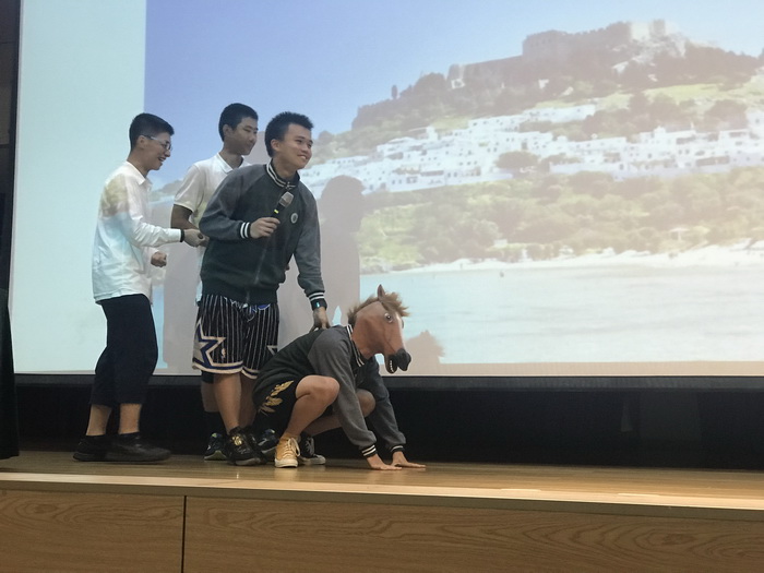 直升2班的《缘浅情深》。这部剧的风格轻松活泼,与《刻》的深邃凝重形成鲜明反差。王子、公主情深似海,牛怪一口方言,贪婪无厌,结果被王子所杀,引得宙斯震怒。表演的同学演绎到位,活灵活现。他们配合得当、气场震撼,语气到位,诙谐幽默的表演引人发笑。