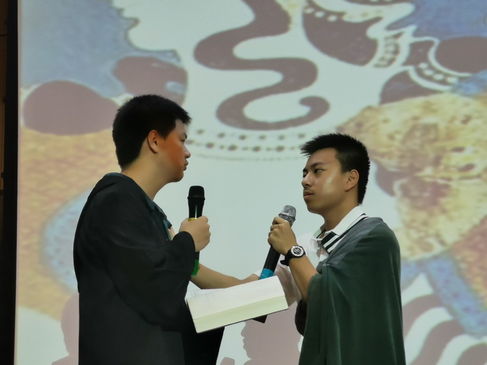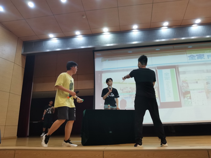 灯光变幻,场景转变,直升3班的同学为我们带来了《从全家到三星堆》。大祭司绚丽登场,展开了一部脑洞大开的穿越剧。大祭司穿越成全家售货员,顾客穿越回三星堆,阻止洪水爆发的使命责任,结局反转的离奇诡谲……精彩的剧情,让人舍不得移开眼睛。祭司坚守使命的责任感让全剧的思想深刻了不少。全剧情节跌宕起伏,趣味盎然,扣人心弦,反映了同学们的巧妙用心和丰富想象。