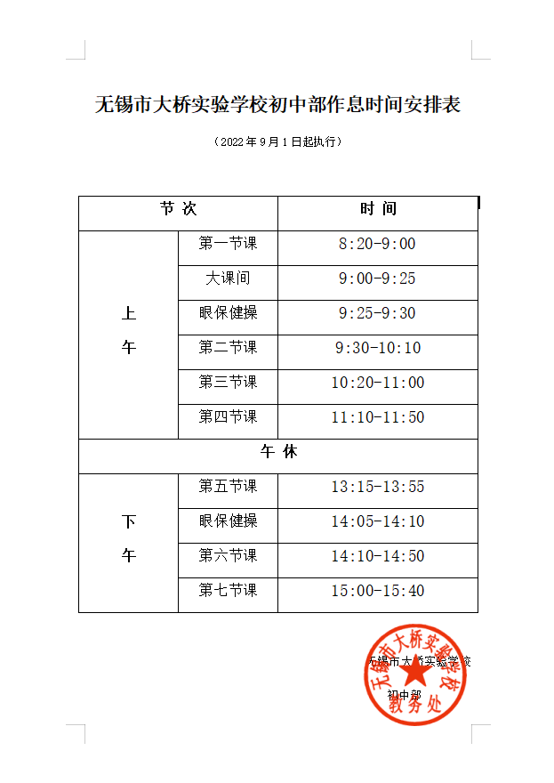 2022-2023学年大桥实验学校初中部作息时间安排公示